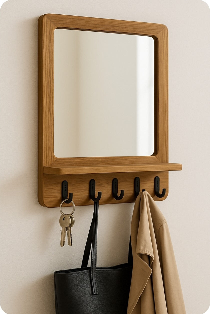 "مرآة حائطية أنيقة بخطّافات ورف خشبي – التنظيم والستايل في قطعة واحدة! مثالية للمدخل، مفاتيحك وحقائبك ستجد مكانها الجديد."